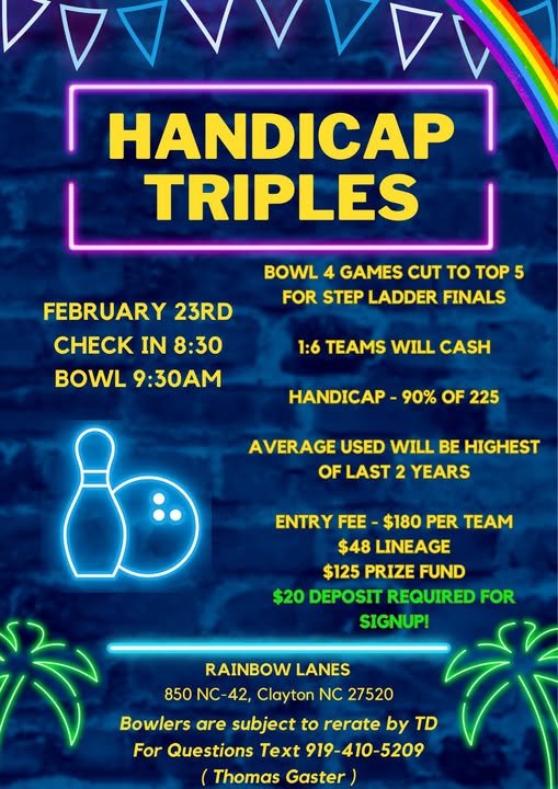 Rainbow Lanes Handicap Triples February 23, 2025 @ 8:30 am - 3:30 pm Rainbow Lanes 850 NC-42, Clayton, NC $180