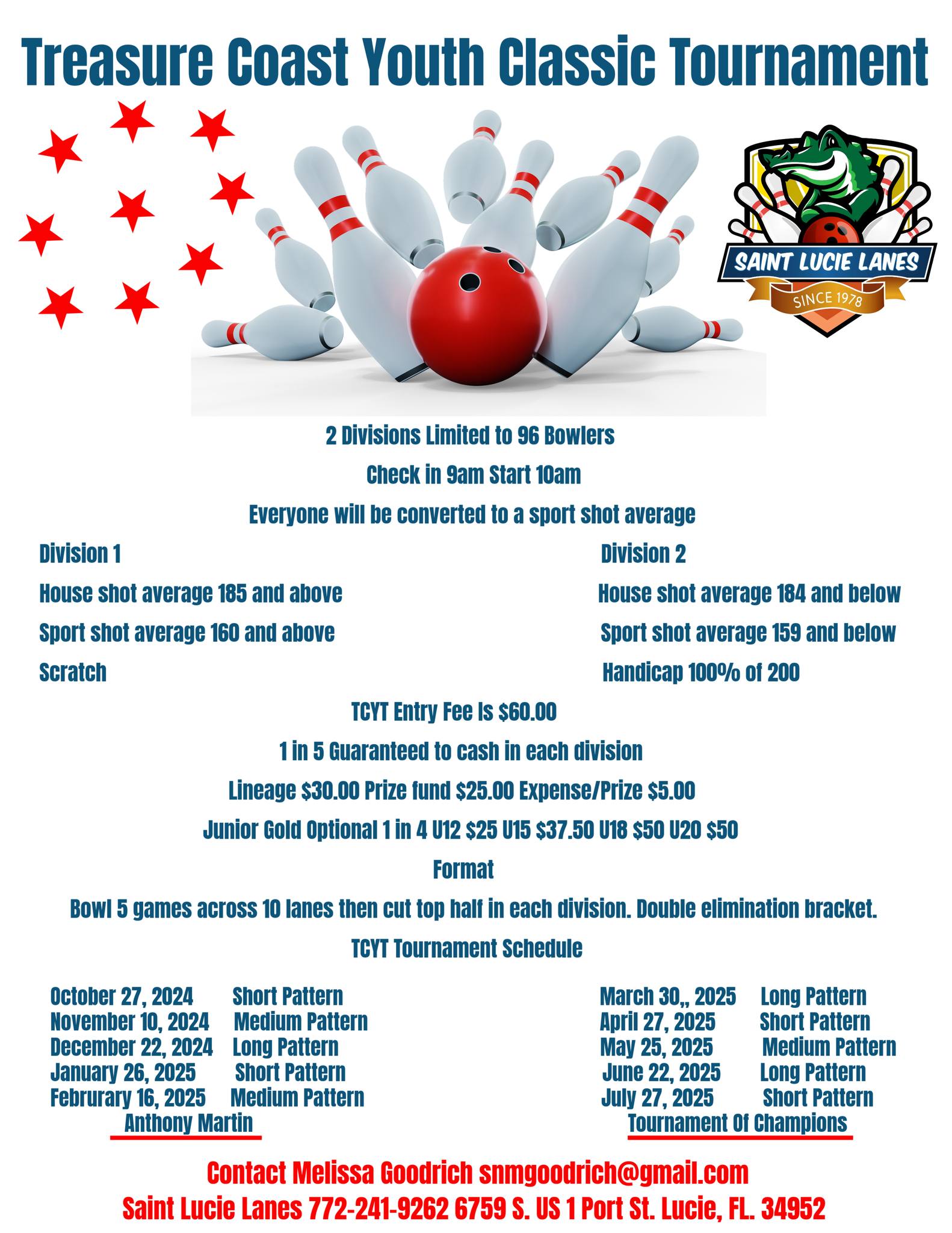 Treasure Coast Youth Classic Tournament February 16, 2025 @ 9:00 am - 5:00 pm Saint Lucie Lanes 6759 US-1, Port, St. Lucie, FL $50