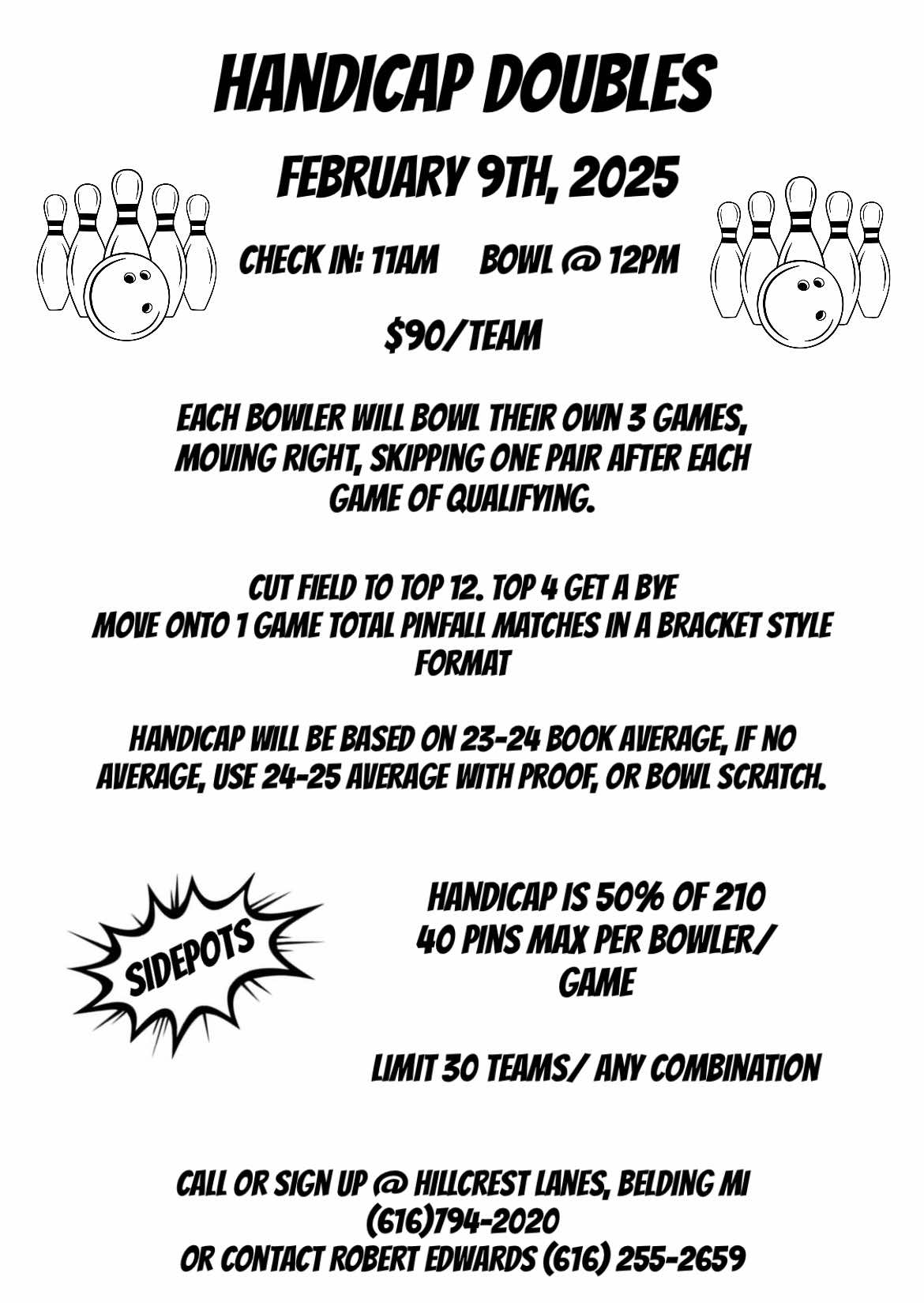 Hillcrest Lanes Handicap Doubles February 9, 2025 @ 11:00 am - 5:00 pm Hillcrest Lanes Belding 420 E State St, Belding, MI $90