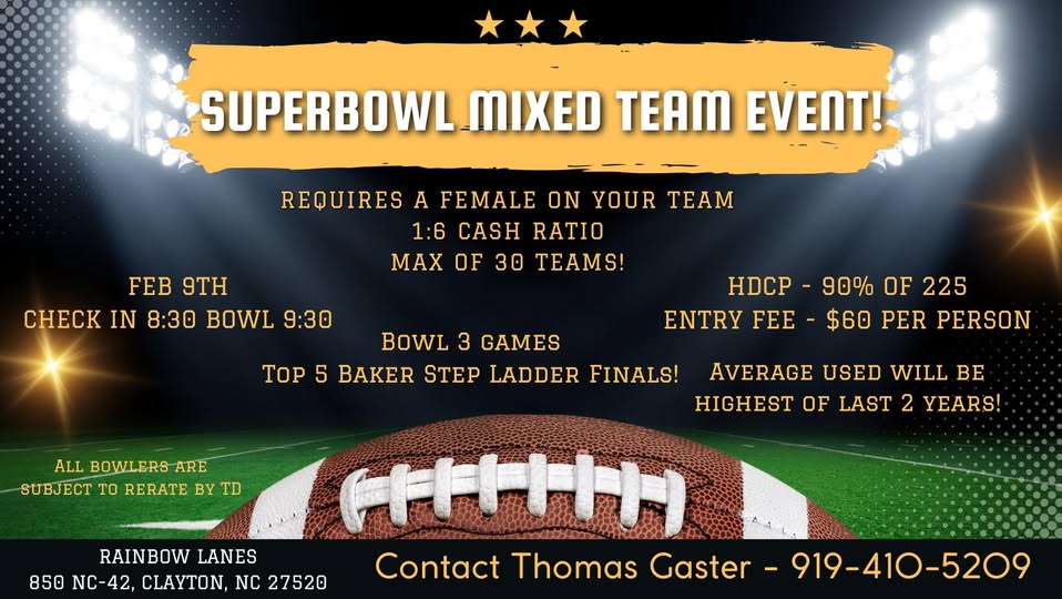 Superbowl Mixed Team Event February 9, 2025 @ 8:30 am - 2:00 pm Rainbow Lanes 850 NC-42, Clayton, NC $60