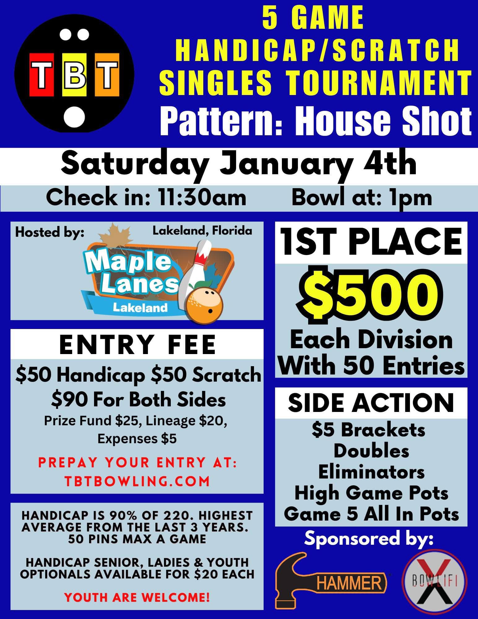 Maple Lanes Handicap/Scratch Singles Tournament January 4, 2025 @ 11:30 am - 5:00 pm Maple Lanes 4318 US Highway 98 North, Lakeland, FL $90