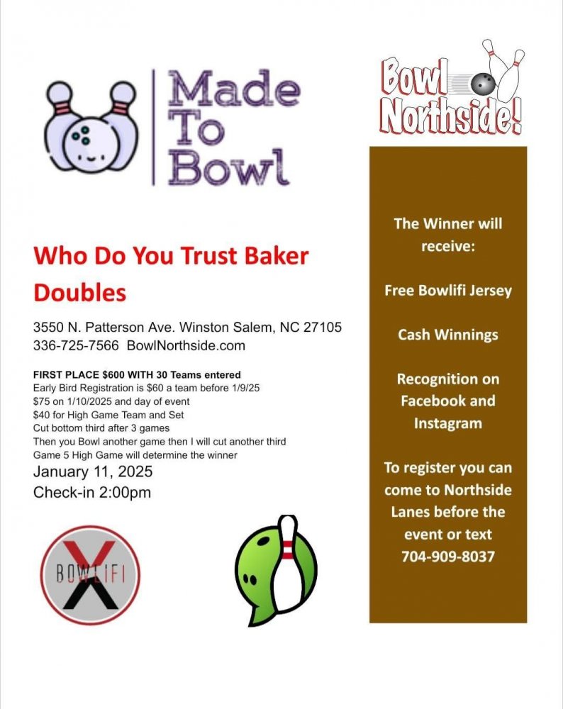 Who Do You Trust Baker Doubles January 11, 2025 @ 2:00 pm - 6:00 pm Northside Lanes 3550 Patterson Ave, Winston-Salem, NC $60