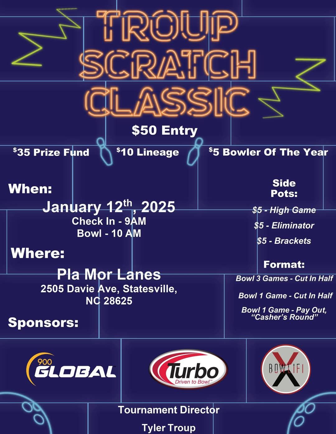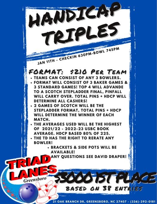 Triad Lanes Handicap Triples January 11, 2025 @ 6:30 pm - 10:30 pm Triad Lanes 21 Oak Branch Dr, Greensboro, NC $210