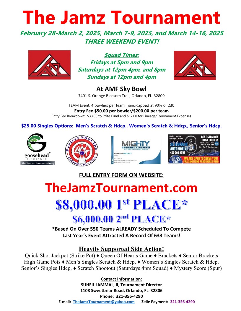 The Jams Tournament February 28, 2025 @ 10:00 am - March 16, 2025 @ 10:00 pm AMF Sky Bowl 7401 S Orange Blossom Trl, Orlando, FL $200