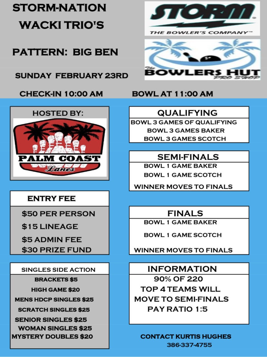 Storm Nation Wacki Trio’s February 23, 2025 @ 8:00 am - 5:00 pm Palm Coast Lanes 11 Old Kings Rd, Palm Coast, FL $50