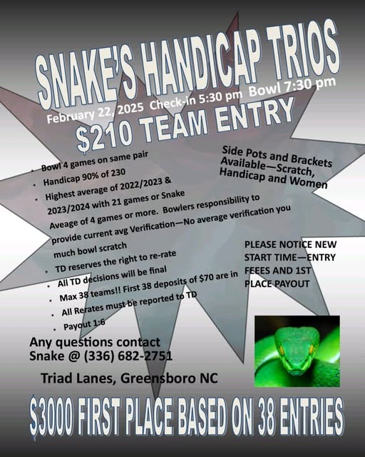 Snake’s Handicap Trios February 22, 2025 @ 5:30 pm - 10:00 pm Triad Lanes 21 Oak Branch Dr, Greensboro, NC $210