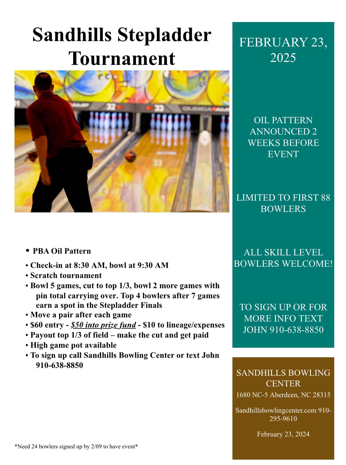 Sandhills Stepladder Tournament February 23, 2025 @ 8:30 am - 3:30 pm Sandhills Bowling Center 1680 NC Highway 5, Aberdeen, NC $60