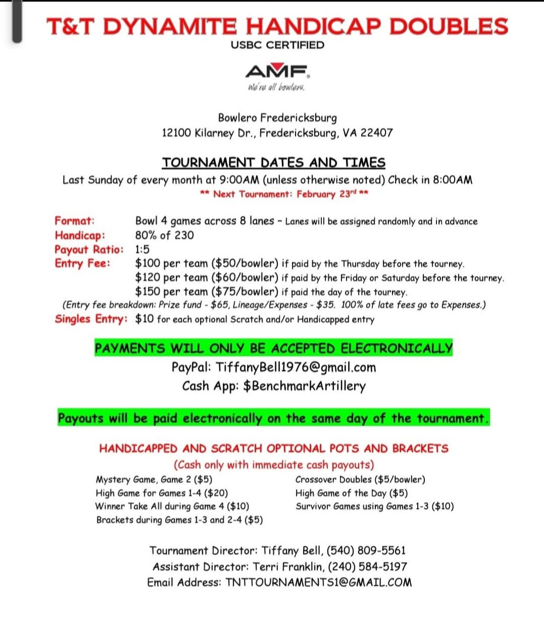 T&T Dynamite Handicap Doubles February 23, 2025 @ 8:00 am - 5:00 pm Bowlero Fredericksburg 12100 Kilarney Dr, Fredericksburg, VA $100