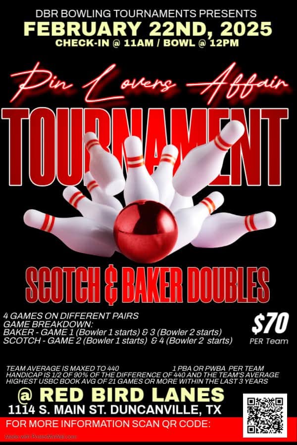 DBR Bowling Pin Lovers Affair Tournament February 22, 2025 @ 11:00 am - 6:00 pm Red Bird Lanes 1114 S Main St, Duncanville, TX $70