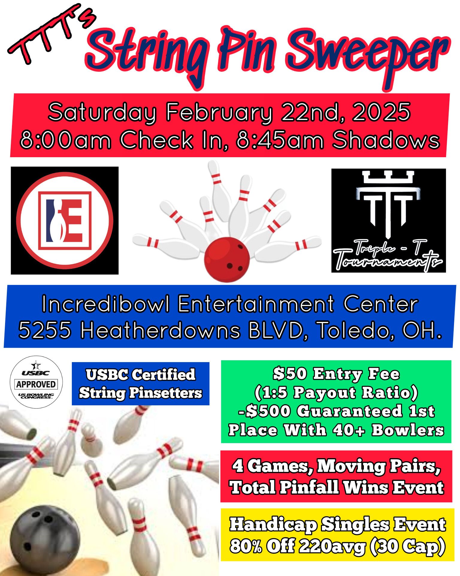 TTT’s String Pin Sweeper February 22, 2025 @ 8:00 am - 4:00 pm Incredibowl Entertainment Center 5255 Heatherdowns Blvd, Toledo, OH $50