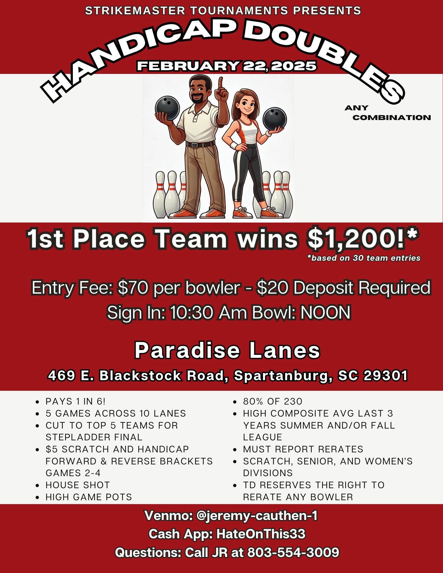Strikemaster Handicap Doubles February 22, 2025 @ 10:30 am - 5:00 pm Paradise Lanes 469 E Blackstock Rd, Spartanburg, SC $70