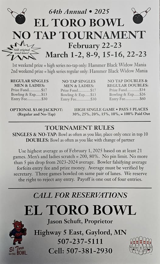 El Toro Bowl No Tap Tournament February 22, 2025 @ 9:00 am - March 23, 2025 @ 5:00 pm El Toro Bowl 112 High Ave, Gaylord, MI $120
