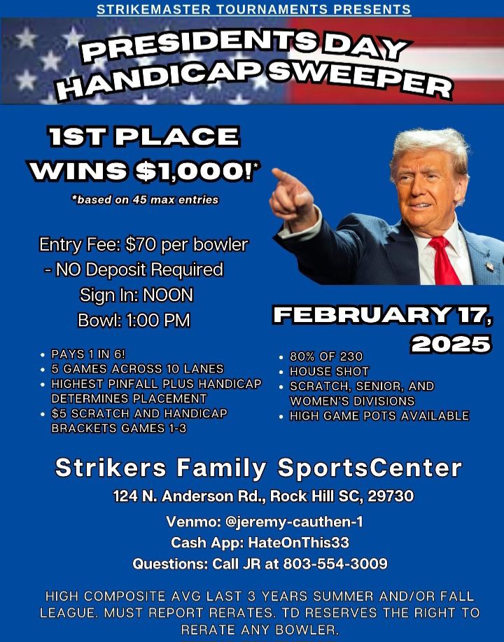 Presidents Day Handicap Sweeper February 17, 2025 @ 12:00 pm - 6:00 pm Strikers Family Sportscenter 124 Anderson Rd, Rock Hill, SC $70