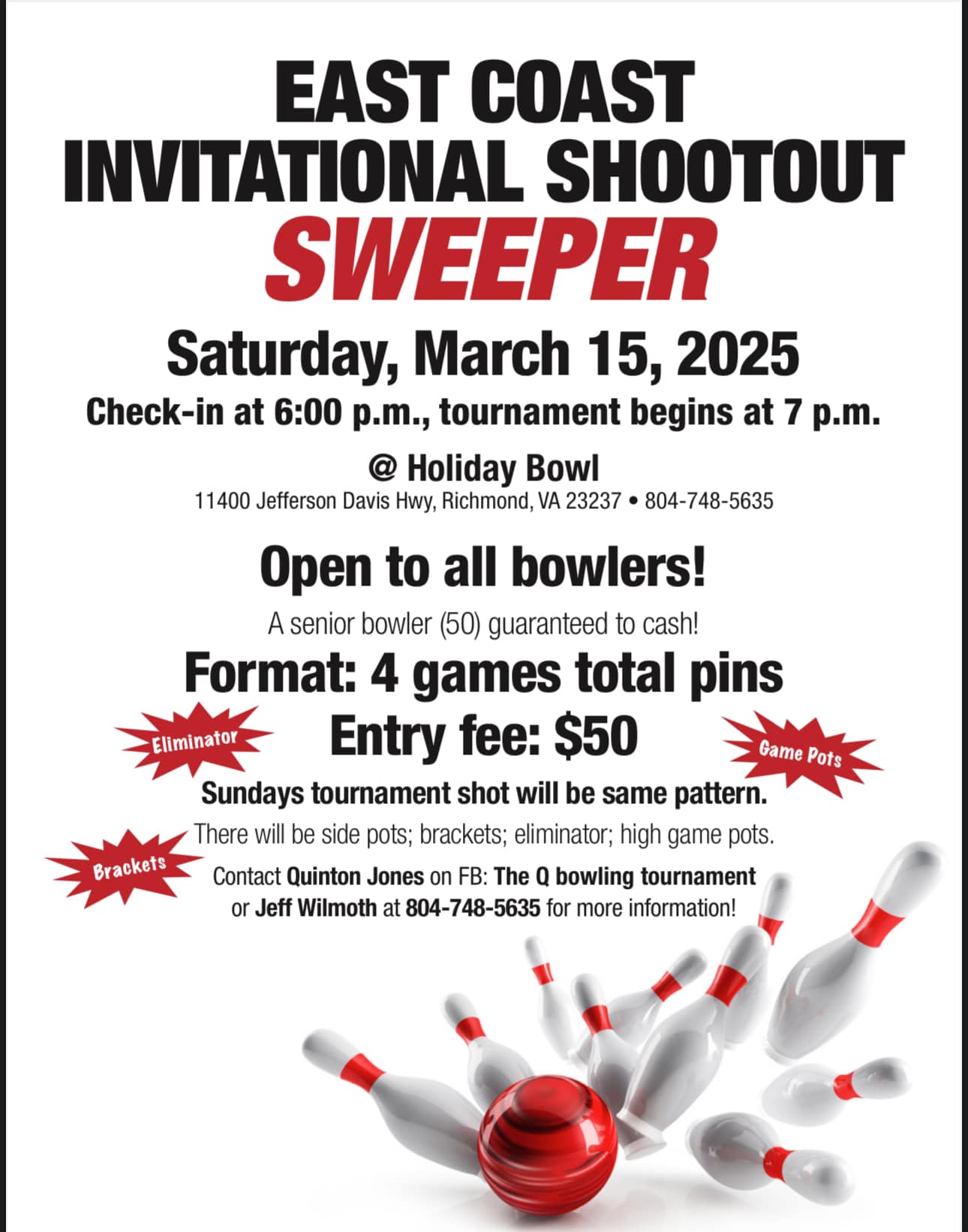 East Coast Invitational Shootout Sweeper February 15, 2025 @ 6:00 pm - 10:00 pm Holiday Bowl 11400 Jefferson Davis Hwy, Chester, VA $50