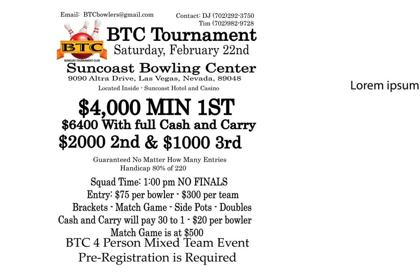 Suncoast BTC Tournament February 22, 2025 @ 12:30 pm - 6:00 pm Suncoast Bowling Center 9090 Alta Dr, Las Vegas, NV $75