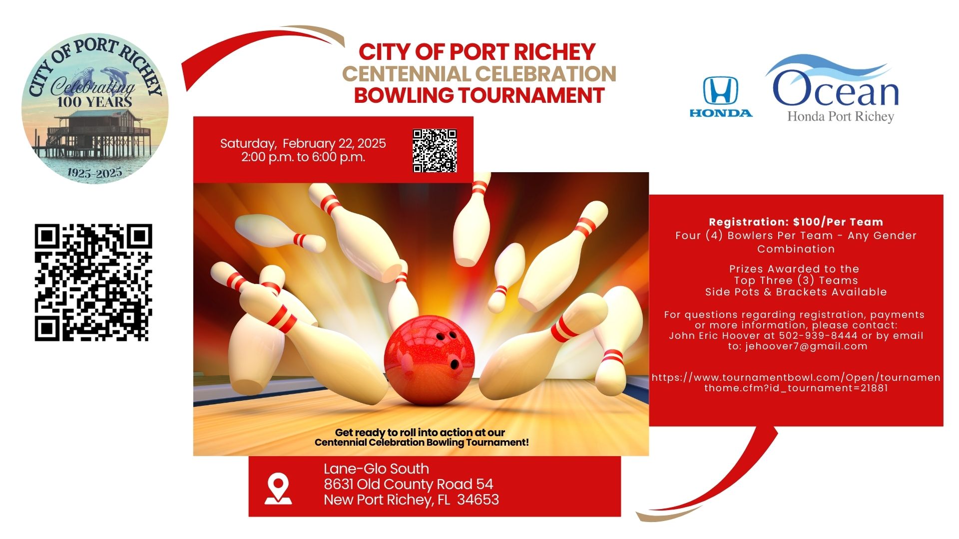 City Of Port Richey Centennial Celebration Bowling Tournament February 22, 2025 @ 2:00 pm - 6:00 pm Lane-Glo South New Port Richey 8631 State Rd 54, New Port Richey, FL $100