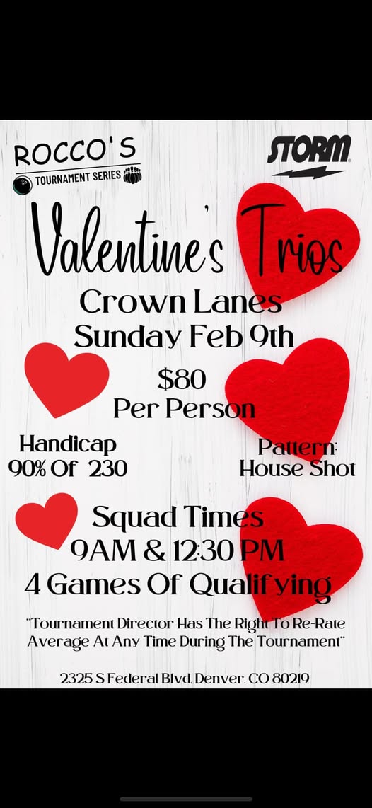Rocco’s Valentines Trios February 9, 2025 @ 8:00 am - 7:00 pm Crown Lanes 2325 S. Federal Blvd, Denver, CO $80