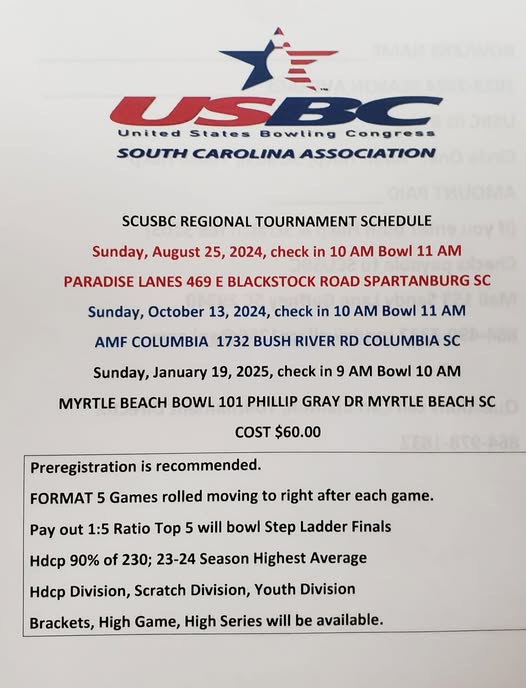 SCUSBC Regional Tournament January 19, 2025 @ 9:00 am - 2:00 pm Myrtle Beach Bowl 101 Gray Dr, Myrtle Beach, SC $60