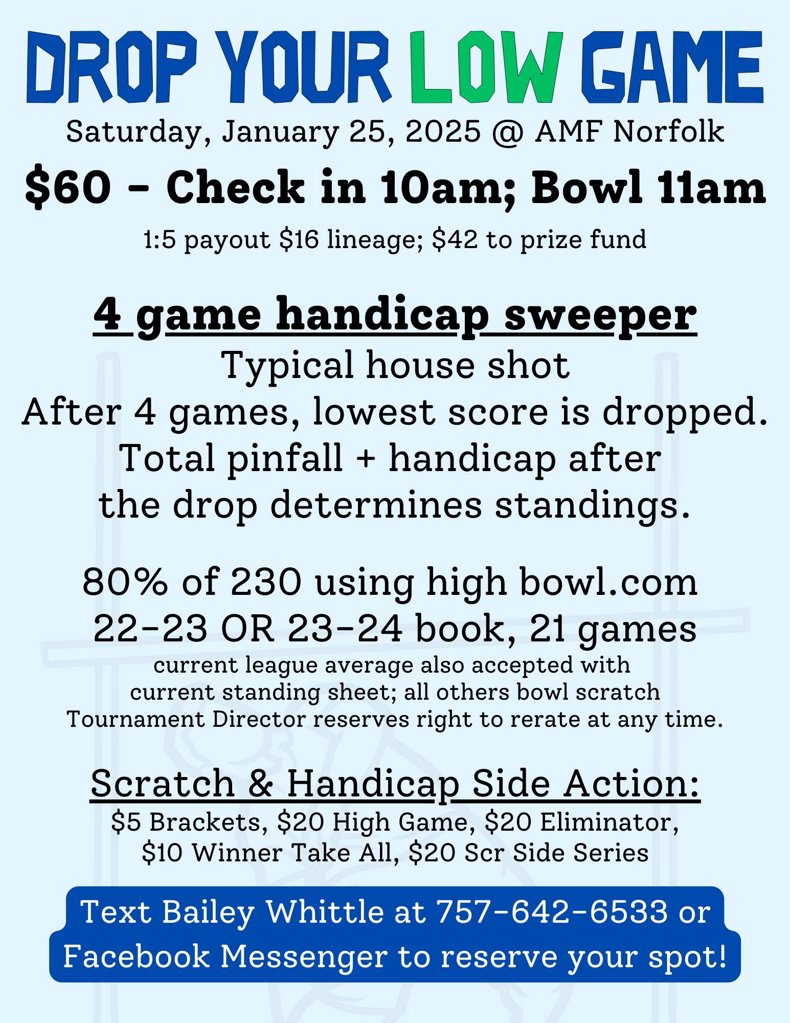 Drop Your Low Game Singles January 25, 2025 @ 10:00 am - 5:00 pm AMF Norfolk Lanes 2441 E Little Creek Rd, Norfolk, VA $60