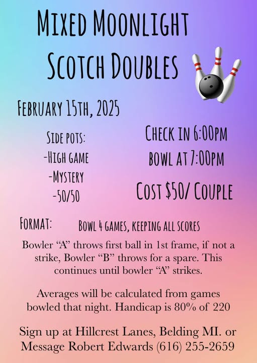 Mixed Moonlight Scotch Doubles January 20, 2025 @ 6:00 pm - 10:00 pm Hillcrest Lanes Belding 420 E State St, Belding, MI $50