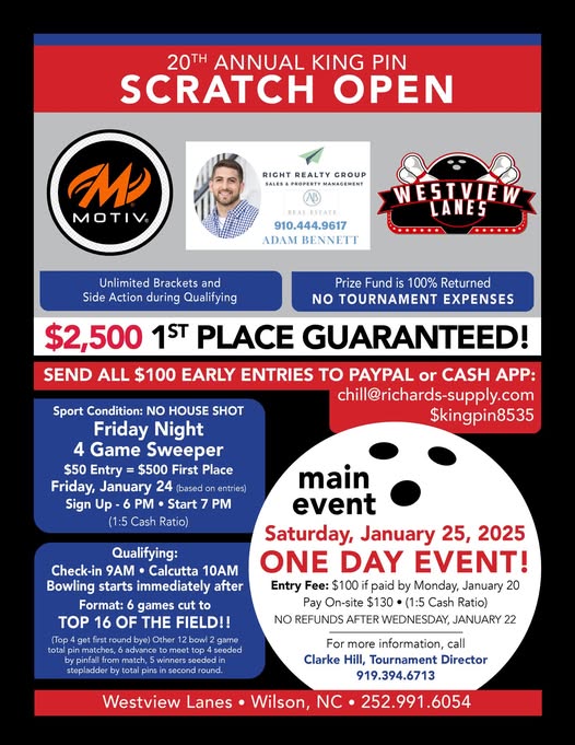 20th Annual King Pin Scratch Open January 25, 2025 @ 9:00 am - 3:00 pm Westview Lanes 1700 Ward Blvd, Wilson, NC $100