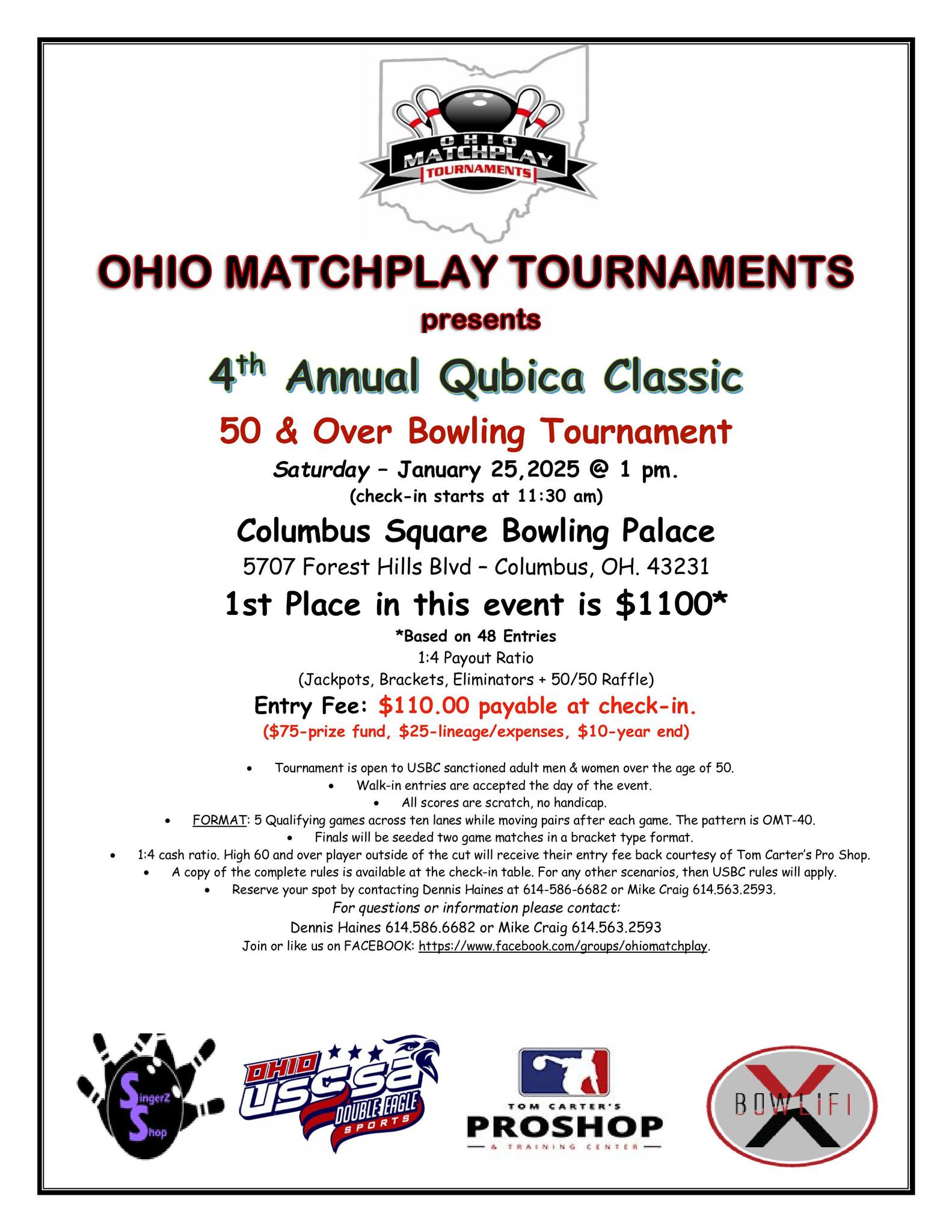 Ohio Matchplay Tournaments 4th Annual Qubica Classic January 25, 2025 @ 11:30 am - 5:30 pm Columbus Square Bowling Palace 5707 Forest Hills Blvd, Columbus, OH $110