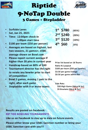Riptide 9 No Tap Doubles January 25, 2025 @ 12:00 pm - 7:00 pm Surfside Lanes 510 US-17 BUS, Surfside Beach, SC $100