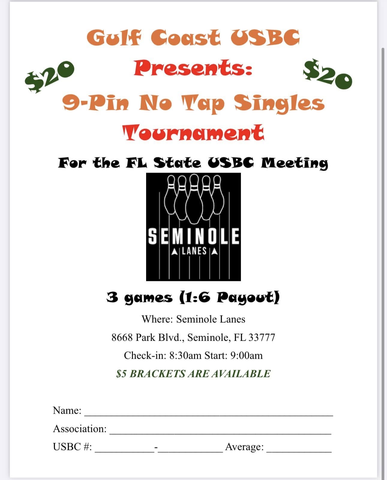 Gulf Coast USBC 9 Pin No Tap Singles January 25, 2025 @ 8:30 am - 5:00 pm Seminole Lanes 8668 Park Blvd, Seminole, FL $20