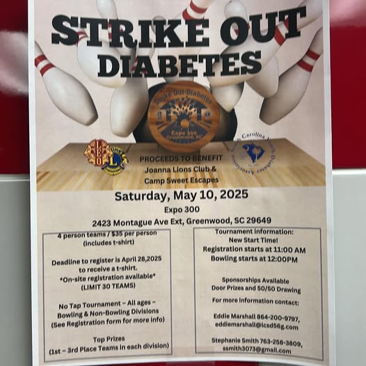 Expo 300 Strike Out Diabetes May 10, 2025 @ 11:00 am - 2:00 pm Expo 300 2423 Montague Avenue Ext, Greenwood, SC $35