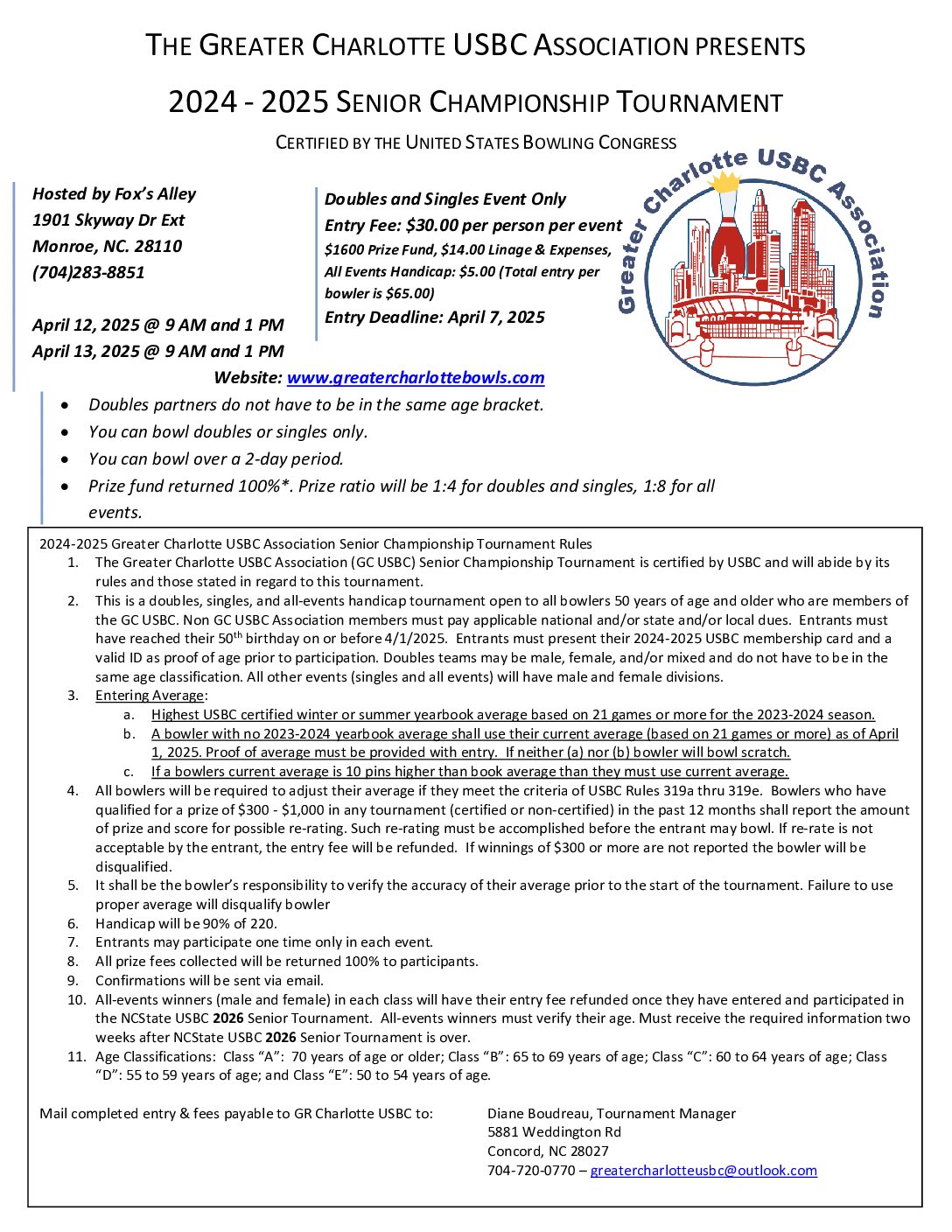 THE GREATER CHARLOTTE USBC ASSOCIATION PRESENTS 2024 – 2025 SENIOR CHAMPIONSHIP TOURNAMENT April 12, 2025 @ 9:00 am - April 13, 2025 @ 6:00 pm Fox’s Alley 1901 Skyway Dr Ext, Monroe, NC $65